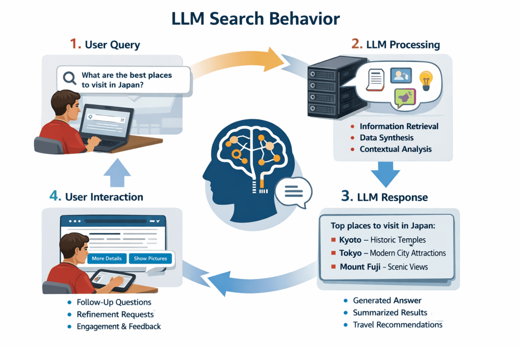 LLM search behavior shines in scenarios where synthesis and explanation are more valuable than raw links. Common use cases include: