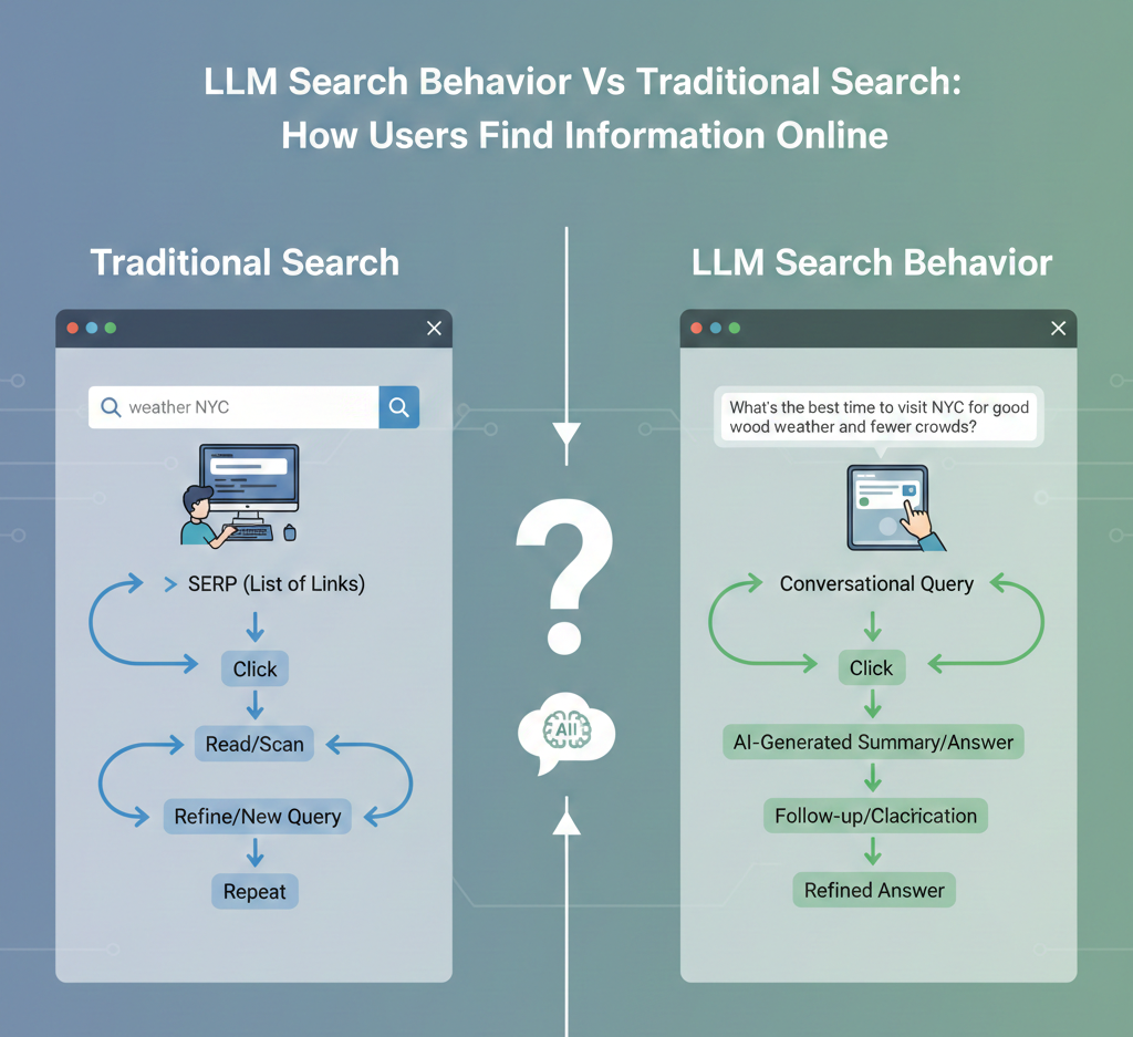 When users ask a conversational AI to “compare CRISPR delivery methods” and receive a synthesized answer with citations, they reveal a shift that traditional keyword search never anticipated. LLM search behavior prioritizes intent, context and iterative dialogue, turning queries into conversations rather than one-off lookups. In 2024 and 2025, tools like Google’s AI Overviews, Bing Copilot and retrieval-augmented platforms such as Perplexity changed how data surfaces, reducing link hopping while increasing reliance on model reasoning and source blending. This evolution reshapes discovery: users refine prompts, request summaries or code and expect up-to-date grounding, while traditional search still optimizes ranking signals and blue links. Understanding how these modes differ explains why zero-click answers rise, why citations matter again and how details literacy now includes prompt craft and model trust.