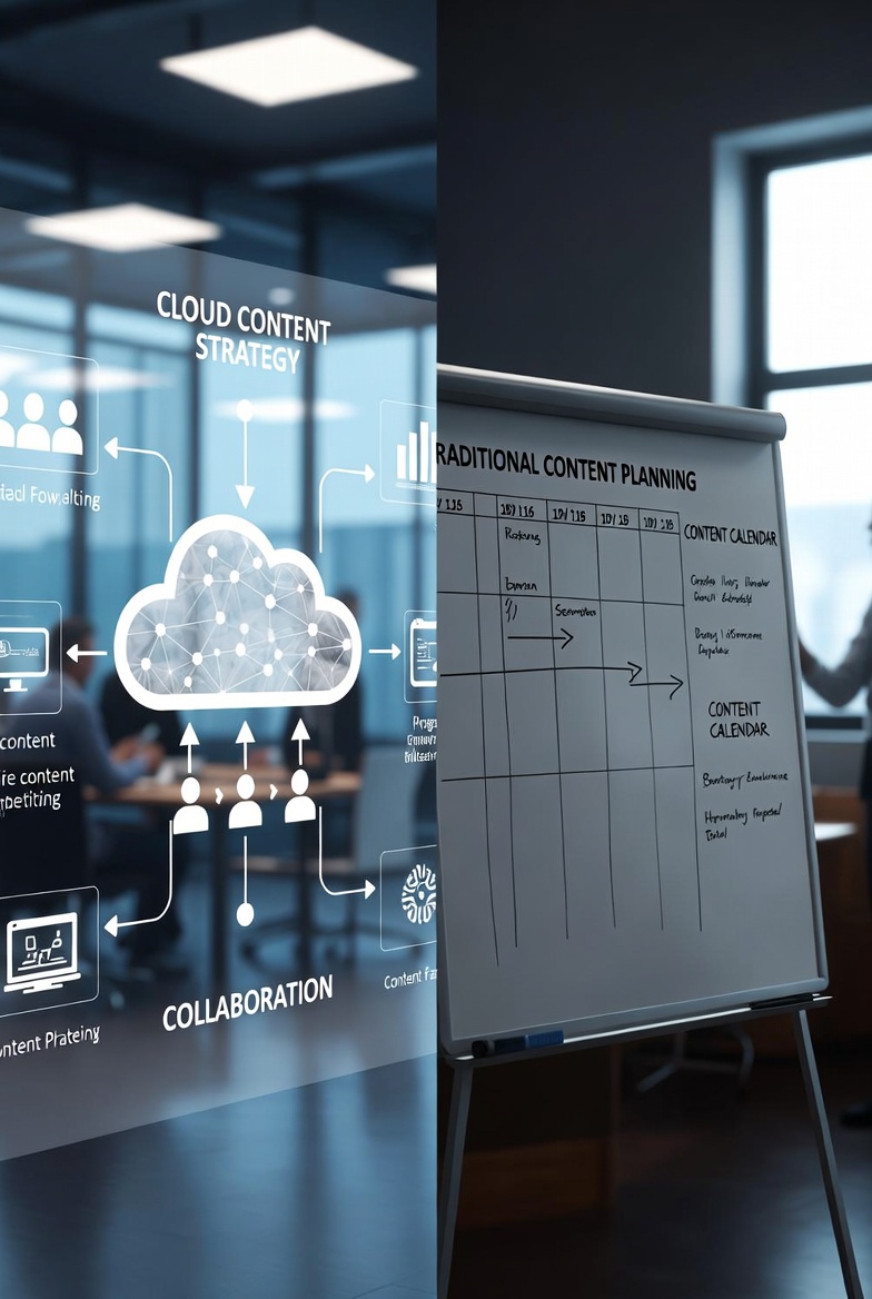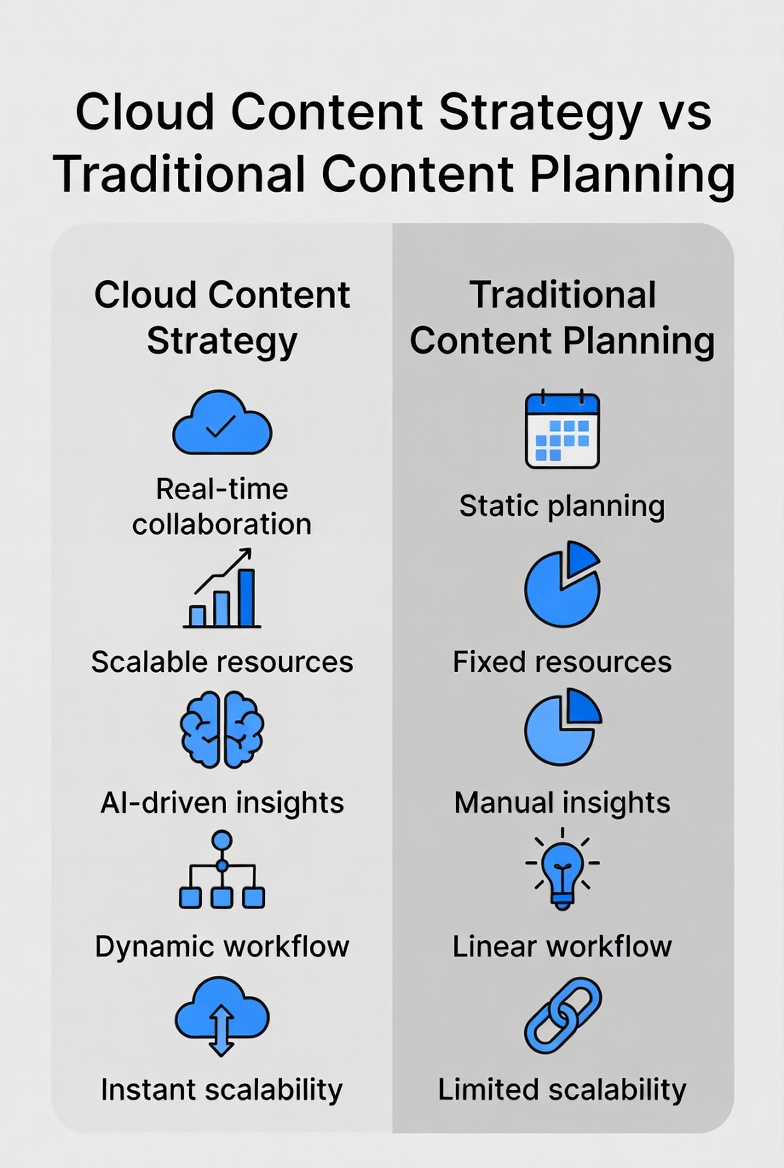 A cloud content strategy relies on cloud-based platforms to create, manage and distribute content in real time, while traditional content planning usually follows fixed schedules, manual workflows and on-premise tools. The cloud approach is more flexible and data-driven, whereas traditional planning is more linear and slower to adapt.